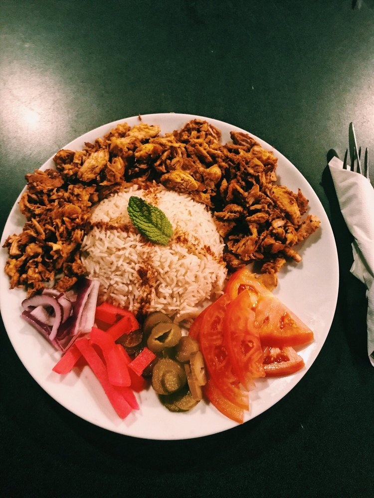 Marinated beefsteak slowly cooked to perfected served with hummus tomato onion pickles and tahini sauce.